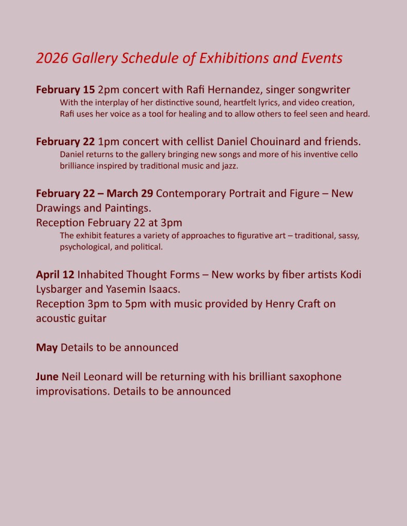 UPDATE!!!!! Performing at the gallery October 20, 2024, 2:30-3:30pm, EMILY SCLAR AND FRIENDS, and JOEY MADISON